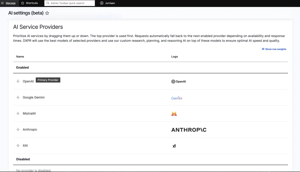 Site builders can enable DXAI under /admin/dxpr_studio/dxpr_builder/ai_settings