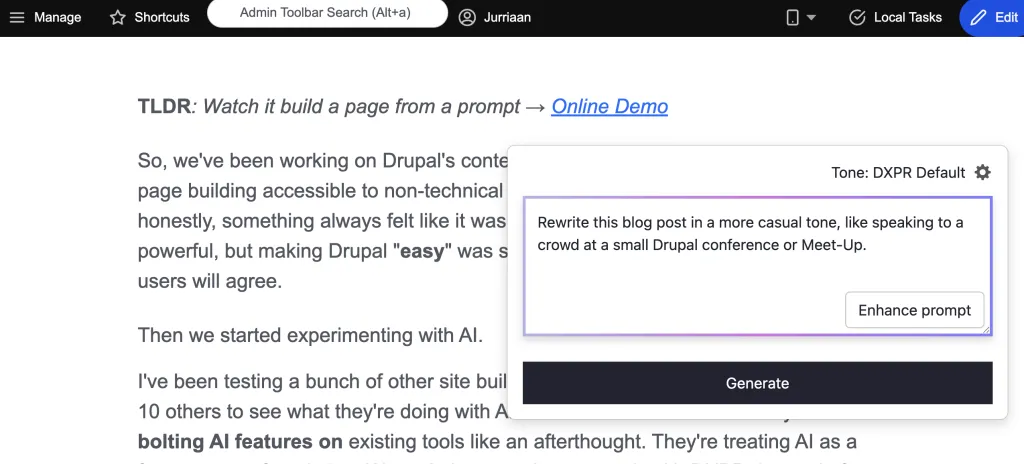 I've been testing a bunch of other site builders: Webflow, Elementor, Divi, and about 10 others to see what they're doing with AI. Here's what I discovered: they're all bolting AI features on existing tools like an afterthought. They're treating AI as a feature, not a foundation. We took the opposite approach with DXPR. Instead of adding AI to a traditional editor, we built the entire experience around AI-first principles. The difference is striking, and I'd love to show you exactly how this fundamentally changes the way you build pages in Drupal.